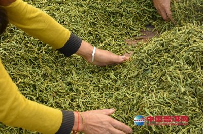 2、摊放 鲜叶进厂后通过分筛分机,要求芽叶长短基本均匀一致,剔除不符合标准芽叶及杂物。分级后摊放在室内阴凉透风干净的竹垫上,厚度2~3cm,时间3~5h,期间要轻翻1~2次。
