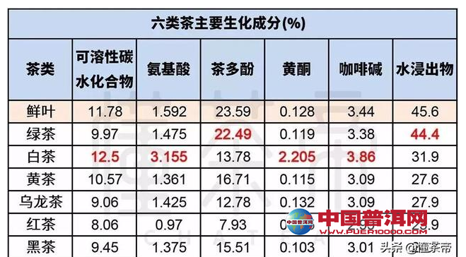 湖南农业大学杨伟丽教授团队,曾采用相同地点、相同嫩度的鲜叶毛蟹春茶,以驻芽二叶、三叶为主的鲜叶为原料,分别按炒青绿茶、远安鹿苑(黄茶)、湖南黑茶、白牡丹(白茶)、铁观音和功夫红茶加工方法加工成六大茶类,主要生化成分含量如下。