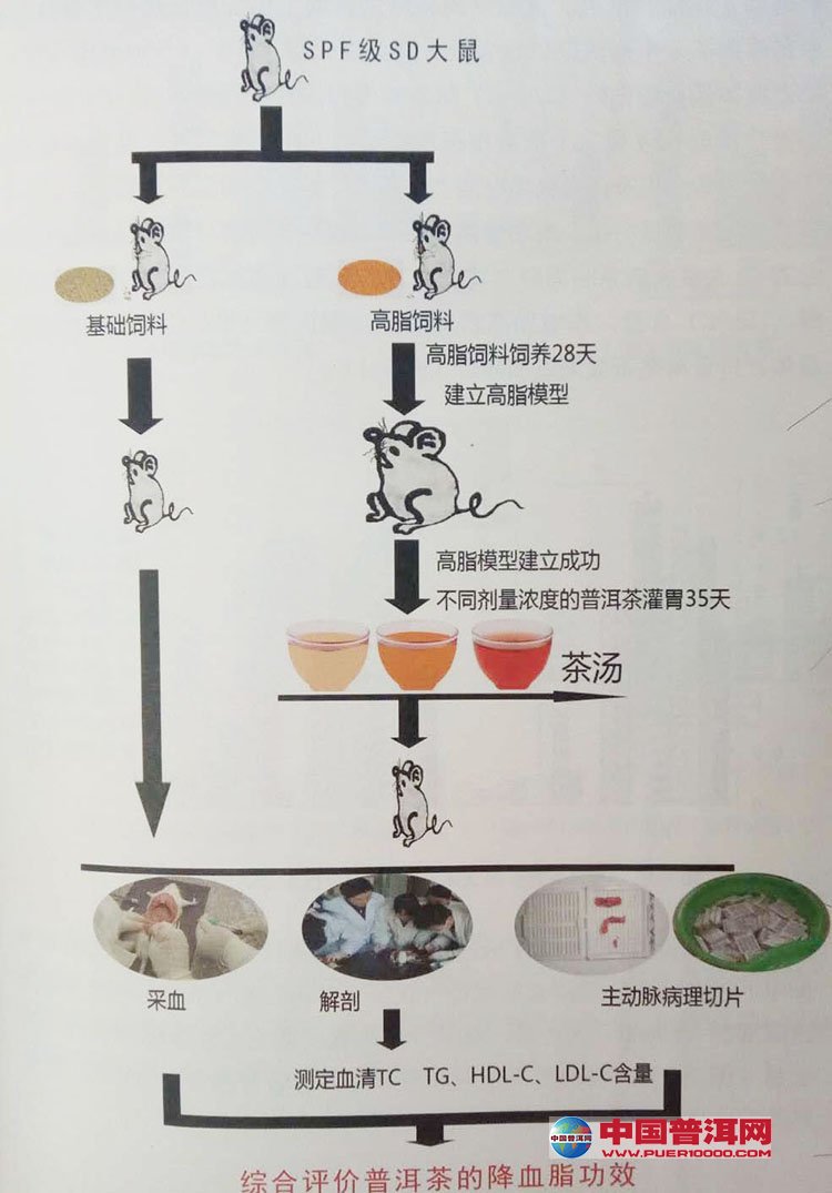 研究已证明,正确地调整血脂水平能有效地将低心脑血管疾病的发病率和死亡率。临床上绝大多数降低血胆固醇水平的方法主要为严格控制饮食并依赖于药物,而降血脂药物的副作用使其应用受到了一定桯度的限制。作为我国传统饮品的茶叶不仅天然,而且大量研究还表明,茶叶有明显的降脂、降糖、降压、改善心血管疾病等多种功效,对于云南的传统特色优势产品普洱茶而言息,效果是否类似尚不清楚,故设置本研究内容,旨在为普洱茶作为降血脂保健食品或原料的可行性研究捉供科学依据。