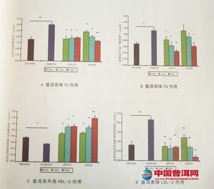 本试验结果表明:普洱生茶和普洱熟茶组与模型组相比,大鼠体重及体脂重量明显减轻,血清总胆固醇、甘油三酯、低密度脂蛋白胆固醇明显降低,主动脉病变情况减轻。说明普洱茶能够预防高脂饮食所致SD大鼠高脂血症的发生,并且普洱熟茶的作用更显著。