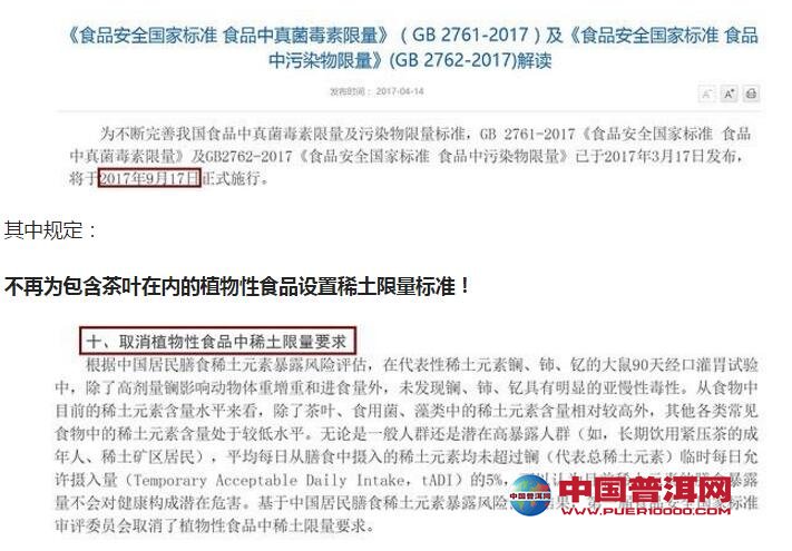 1. 国家卫计委于2017年4月14日正式颁布GB2762-2017《食品中污染物限量》,其中规定:不再为包含茶叶在内的食品设置稀土限量标准!