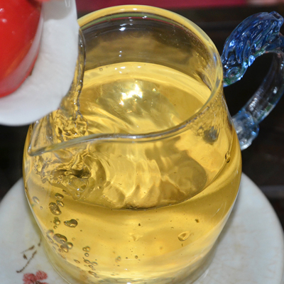 把茶汤注入公道杯中,瞬间清雅的香气扑鼻而来,细赏汤色黄亮清澈,非常宜人。