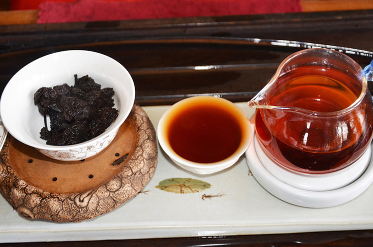 丰富的老茶头内含物质浸出在杯中幻化出红凝通透的茶汤。