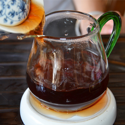 茶头浸润后的汤色比较红浓,茶汤粘稠显示了内含物质的丰富。茶汤入口甘甜柔滑、醇和厚重,丰富而充满张力。