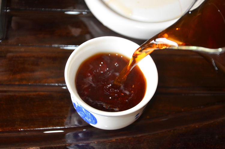 可润茶1--2次,让茶与水充分融合;缓慢出汤:汤色红浓透亮,艳丽无比。