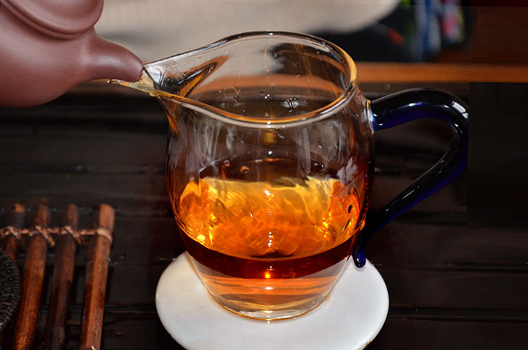 醒茶两道后出汤,茶汤目前已转红,汤色透亮,汤汁浓稠。