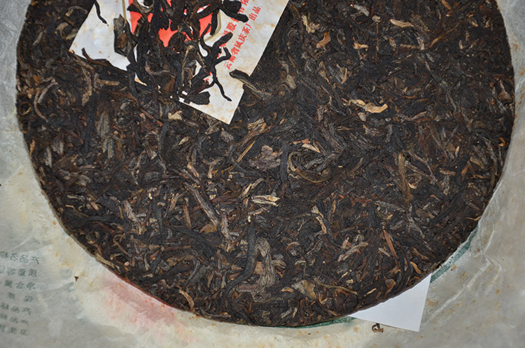 茶饼周正,干茶黑亮油润,整体条索紧结匀整,陈化明显,里外一口料。