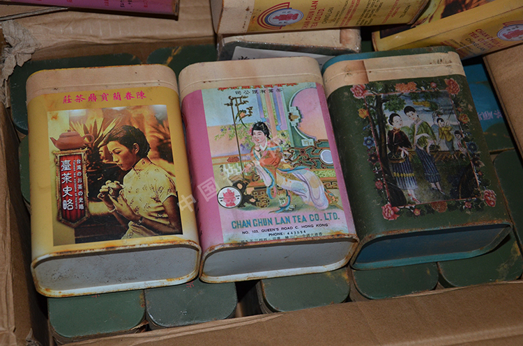 黄色和粉色铁罐装来自“陈春兰宝鼎茶庄”,绿色铁罐来自“新京兴顺茶庄”,皆属于香港民国时期的老字号茶庄。