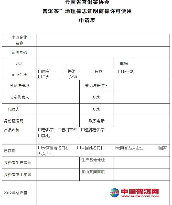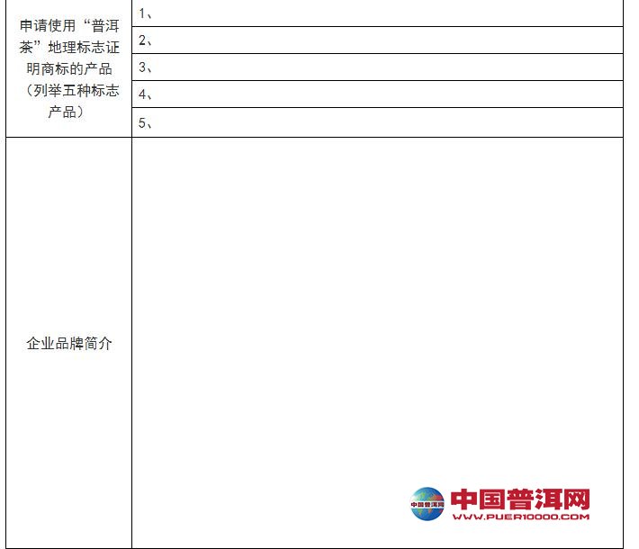 普洱茶地理标志证明商标许可使用申请表及委托书