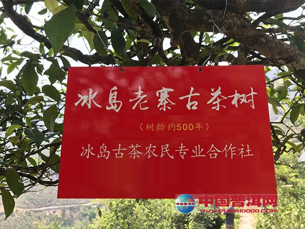 这是冰岛古茶农民专业合作社,为它挂上的身份标识,从标识上可以看到,它是属于冰岛老寨中的古茶树,树龄约500年左右。