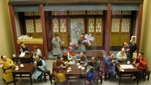 一家茶馆所能给人的目不暇接,老舍茶馆要算是做足了分量,而且敞开门的经营方式,给了“看在茶馆”的可能。一进大门,前厅地面上玻璃砖下的缩微茶馆模型老是能给人一个小小的吃惊。拾级而上,楼梯两侧的老照片里也能找到熟悉的老艺术家在此演出的身影。二楼的四合茶苑,保留了老北京四合院的幽深意味。二楼与三楼的楼梯之间,是六大茶馆各具特色的泥塑场景,书茶馆的曲艺,野茶馆的“草根”,大碗茶馆里特有的粗瓷大碗四方桌……俨然是茶馆文化的小小博物馆。