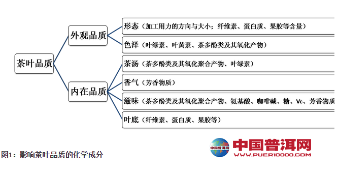 茶叶品质的形成与其本身所含的化学成分茶多酚、氨基酸、咖啡碱、蛋白质、果胶、叶绿素、芳香物质等的含量及相互间的组成比例有很大的关系,这些成分是茶叶品质形成的物质基础。茶鲜叶的化学成分主要受茶树品种、种植的生态环境、栽培的技术措施、鲜叶的生长程度等因素影响。