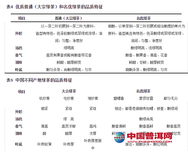 普通(大宗)绿茶和名优绿茶的品质特征(原料嫩度与工艺不同)见表4。相同(近)嫩度与工艺不同产地茶的品质特征见表5。