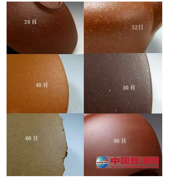 60目左右的泥料制壶,烧成后壶面既细腻又有砂质感,泡养包浆后的光泽度也好,吸水率约在3%~5%,所含石英、云母、赤铁矿等物质结晶相多而玻相少,有较佳的抗震性、透气性和物理强度,经得起骤冷骤热,透气不透水,泡茶不发生化学反应而只发生相宜的物理反应。现在制坯,手工制备的泥料为60目左右,机械制备的泥料在100~120目。