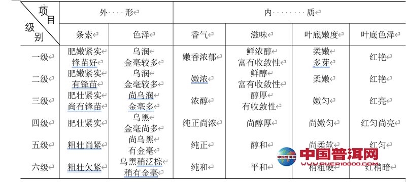 滇红工夫金毫显露为其品质特点之一。其毫色可分淡黄、菊黄、金黄等类。风庆、云县、昌宁等地工夫茶,毫色多呈菊黄,勐海、双扛、临沧、普文等地工夫茶,毫色多呈金黄。根据产品质量的优次,滇红工夫红茶由最初的三个等级逐渐演变为六个等级,各级品质特征如下: