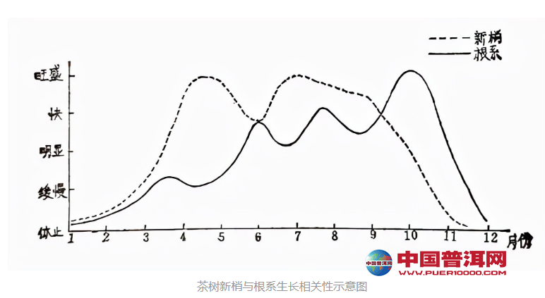 茶树根系一年都在生长活动中,有一定的周期性,一年中约有三四个较活跃的生育期,而且一个周期内与地上部表现不同步,就是说“根”与“株”的生长和休止在时间上有互相交替的现象。当株生长停止时根生长最活跃,株生长最活跃时根的生长就缓慢。江南茶区,茶树在4~5月新梢生长活跃,根系活动相对缓慢,10月以后,新梢生长开始休止,而根系生长较旺盛。这种发根和发芽的交替现象,是由于株的光合产物主要供应各时期的生长部位。新梢发育时,光合产物向芽梢生长转移,供应株的消耗;新梢生长休止或休眠时,株的生长停止,光合产物对芽的生长不起作用,多余的光合产物就供应根的生长,促进根系的发育。在最寒冷的冬季,根系休眠但不休止,仍然可以观察到细根的生长。秋季根系生长最为强盛,吸收能力最强,这时的施肥才有良好效果。农谚“基肥足,春茶绿”就是这道理。