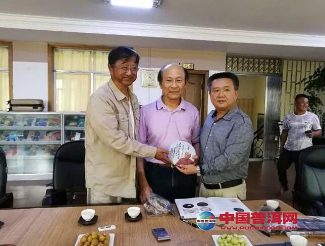 交流过程中,邓时海先生赠送给杂志社一饼亲笔签名的“古稀圆茶”,这是邓时海先生70岁纪念茶,人生七十古来稀,如今已经75岁的邓时海先生依然身体硬朗,精神矍铄,他将这份健康都归功于长期喝普洱茶。同时《普洱》杂志还获赠邓时海先生亲笔签名赠言的经典之作《普洱茶》修订版。我们也赠送给邓先生杂志社最近推出的几个文化产品——十周年典藏、《走进古茶王国》《茶的河流》《古道——六月的背影》等等。