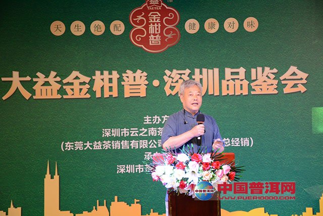 天生绝配,健康对味。东莞大益茶销售有限公司的董事陈向阳作大益7益果青柑普茶的推介。陈总介绍到自2016年8月20日大益金柑普茶系列产品“小青柑”首次面市以来,因醇厚甜滑的大益普洱熟茶加上新会陈皮的馨香,深受“益友”们的青睐。陈总讲到:“一、新会陈皮与云南普洱茶,均属于地理标志产品,受到国家“地理标志专门保护”。陈皮与普洱茶都随陈化时间的增长,内含物质发生动态变化,微生物进行发酵产生对人体有益的物质和香味物质,进而越陈越香,浓郁柔润,香更脱俗,质更醇厚;二、大益金柑普,茶性温和甘醇,老少咸宜,口感清新,是当代都市健康茶饮的不二之选。同时,随着新会陈皮药食同源与新会地域文化价值的不断放大,好的新会陈皮同样具有越陈越贵的特性,配以大益茶标准独特的年份价值,更使得大益金柑普具有稳定的收藏价值。