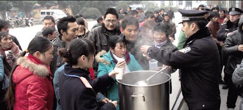 1月24日上午,室外寒风刺骨,市客运中心候车大厅却暖意融融,市青年志愿者服务春运暖冬行动成员正给旅客送上热姜