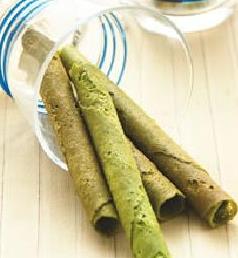 5.蛋捲模上放约50公克的作法3抹茶蛋捲煳,盖上上盖约20秒后,翻锅面再10秒,再翻回来烤20秒,打开上盖,以铁捲棒和手辅助蛋捲捲起,即完成一支抹茶蛋捲。
