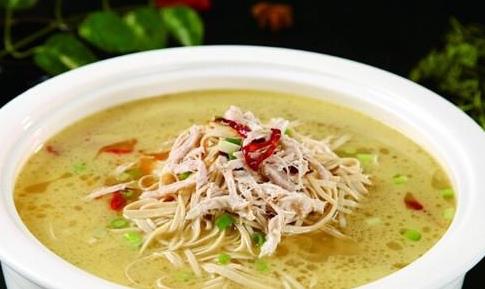 (3)炒锅置旺火上,加入清水烧沸,放人上浆的鸡丝划散,至熟后捞入汤碗内。