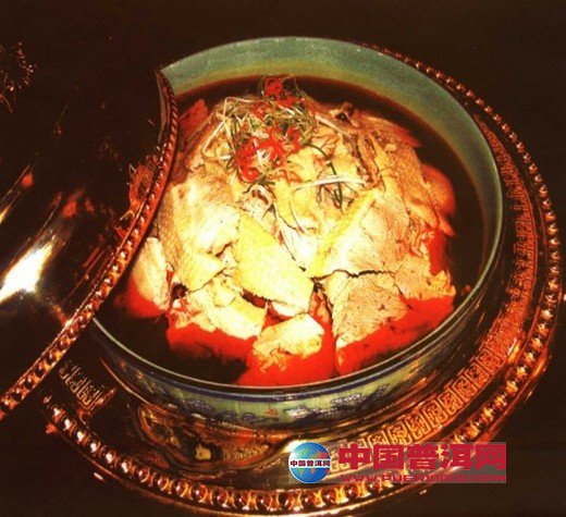 2、炒锅下油,烧热时放八角、草果、辣椒、七甸老酱炒香,下老鹅、普洱茶汁烧开,打去浮沫,改小火煮3-4小时,成熟捞出。