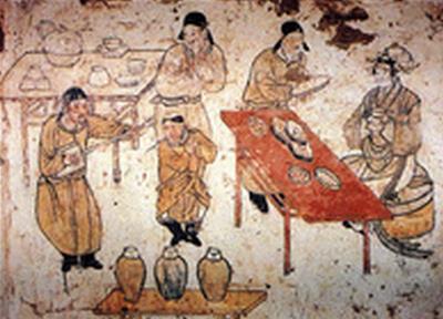 一是当客人到来自家作客的时候,为其倒茶表示迎接。这一习俗其实我们并不陌生, 因为直到现在,我们也还传承着这一优良的传统。据不少记载可见,以茶待客这种饮茶 和接待客人的习俗在北宋的时候就已经非常地流行了。据宋代朱弁《曲洧旧闻》记载: “客至则设茶,欲去则设汤,不知起于何时。然上自官府,下至闾里,莫之或废。”1这 说明这种理解在当时已经成为人们生活中的一个重要部分了。