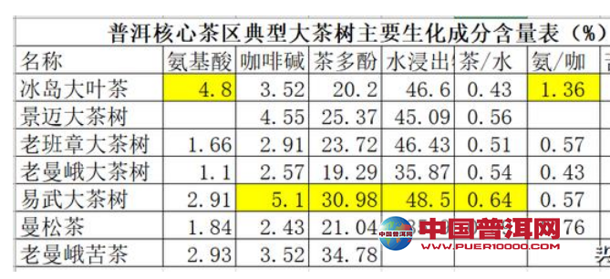 表中咖啡碱一列的数据更是坑爹,公认最苦的老曼峨居然只有区区2.57%,仅仅高于不苦的曼松2.43%!同样证明咖啡碱单项含量的高低并不能决定茶汤的苦味,那些说“茶苦是因为咖啡碱含量高的筒子”是不是被打脸了。