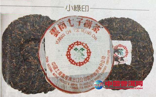 “小绿印七子圆茶”其名称主要源于其外部包装的特色,其外部包装上的大“八中茶标志”中的“茶”字为手工盖印,故在市场上将其称为小绿印。