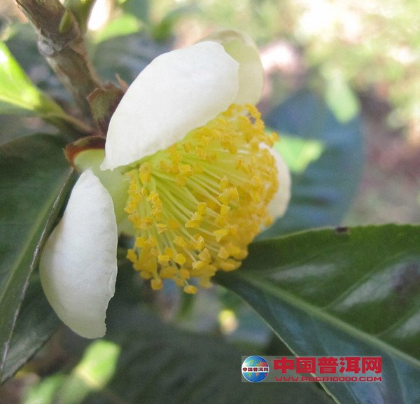 普洱茶树上盛开了一朵普洱花,花瓣呈白色,花蕊呈淡黄色,个头虽不大,只有金橘大小,但是香味扑鼻。