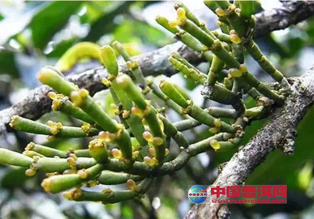 “螃蟹脚”是一种寄生在树龄较高的古乔木茶树上的寄生物, 一般寄生于云南高原某些特定的原始森林边缘且树龄为上百年的老茶树上。“螃蟹脚”因其枝条为节状带毫,所以被当地人称为“螃蟹脚”,学名“扁枝槲寄生”,属扁杆灯芯草,为多生草本。新鲜“螃蟹脚”外观为绿色,晒干后转为棕黄色。冲泡出的汤色黄绿透亮,鲜时有浓郁的特殊清香,陈化后有较浓药香味儿。