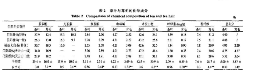 为了检验茶毫的内涵物质,有研究者以不同等级的信阳毛尖以及福鼎大白这两种富含茶毫的茶为样本,对茶身与茶毫所含的内含物质进行了分析测定以及比对。